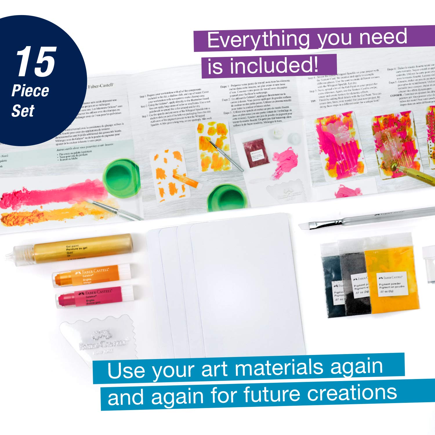 This Mixed Media kit is perfect for a fun night with your friends! Arts and Crafts for adults can be a fun night. You can make up to 4 pieces of Abstract Art together. Completing the 20 minute Abstract Art kit with friends will be perfect because it is for beginners. In the kit you will find instructions to help you along the way. There is instructional videos available to you that will show you step by step how to create abstract art! Also, this kit comes with Mango and Bubble Gum gelatos to help complete your abstract art! Additionally, inside you will find gold gel paint, wipped spakle, pink, yellow, and blue pigment powder, a paint brush, 4 illustration boards, a spatula, a texture card, and a design guide. This unique kit includes all the different mixed media supplies that you need to create an abstract art master piece! See your artwork come to life with the absolute best quality art materials. Faber-Castell has produced premium quality artist materials since 1761.